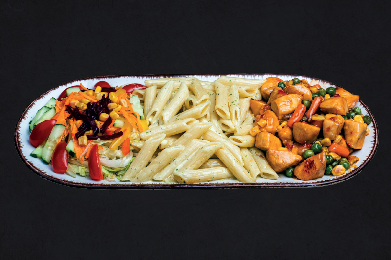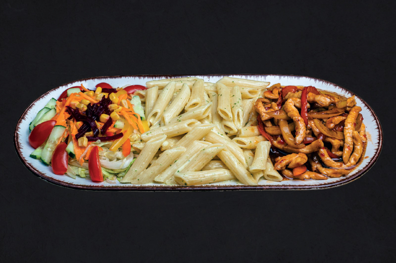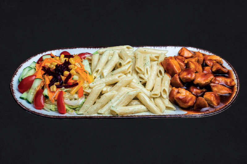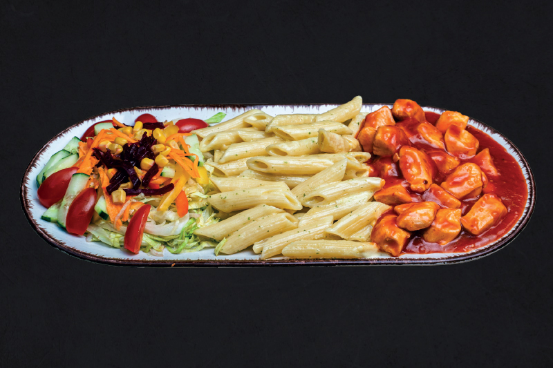 Penne-Pesto, geschmortes Hühnerfleisch, Süßsauer-Sauce und Salat (A,C,G,L,M,O)