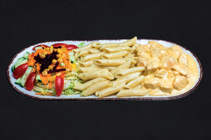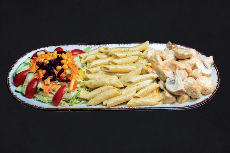 Penne-Pesto, geschmortes Hühnerfleisch, Champignons-Rahmsauce und Salat (A,C,G,L,M,O)