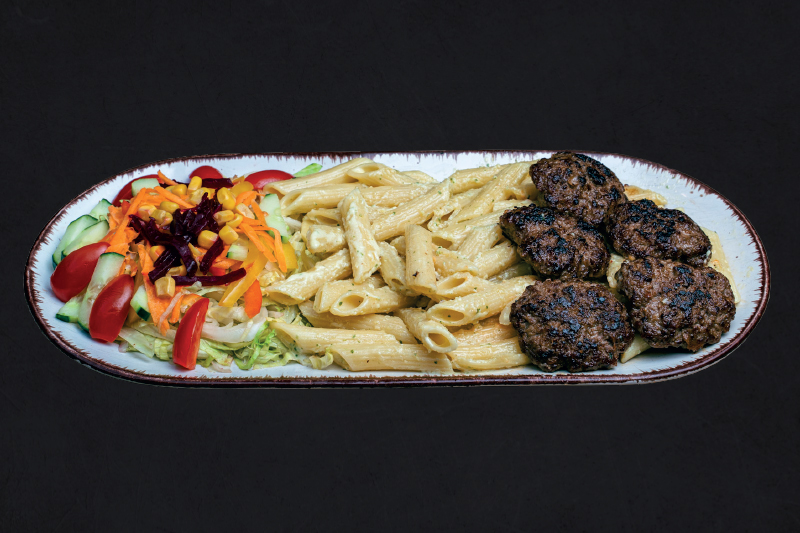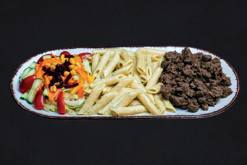 Penne-Pesto, faschiertes Rindfleisch und Salat (A,C,G,L,M,O)