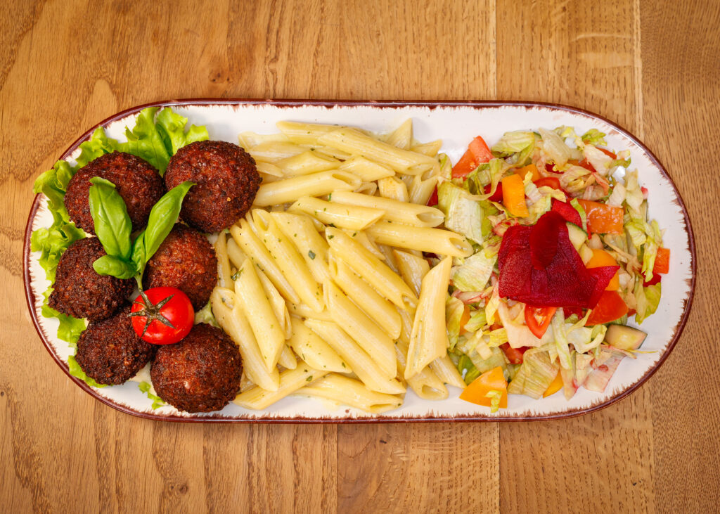 Penne-Pesto, Bratenwürfel, Kalbfleisch und Salat (A,C,G,L,M,O)