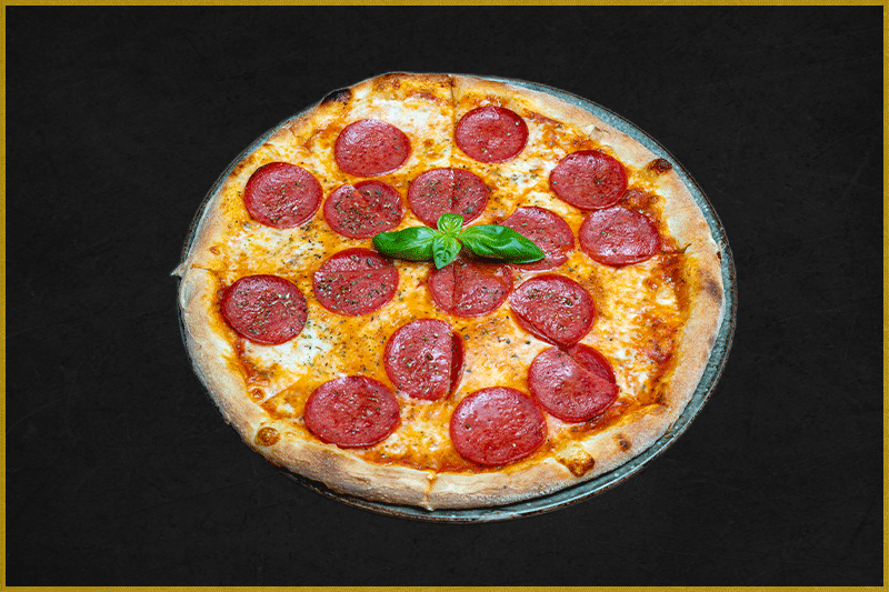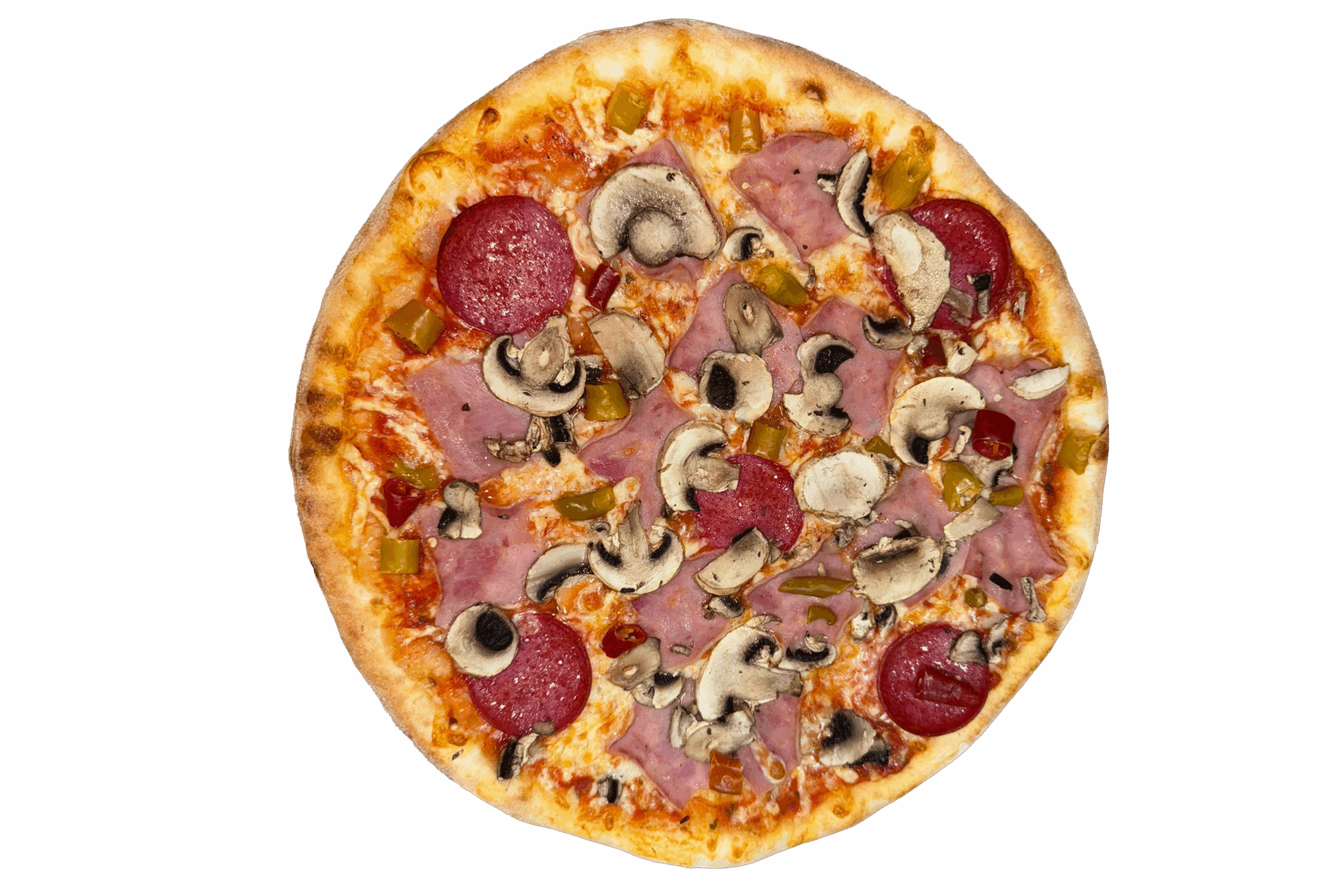 Tomatensauce, Mozzarella, Salami, Toastschinken, Champignons, Scharfe Pepperoni und Knoblauch (A,C,G,L)