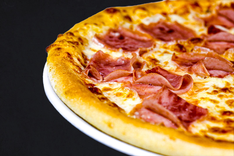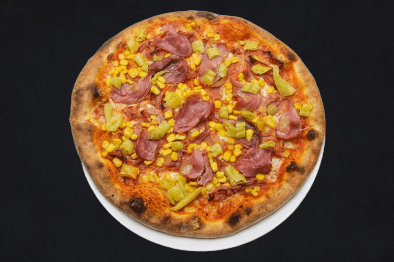 Tomatensauce, Mozzarella, Toastschinken, Rinderspeck, Mais, milde Pepperoni (A,C,G,L)