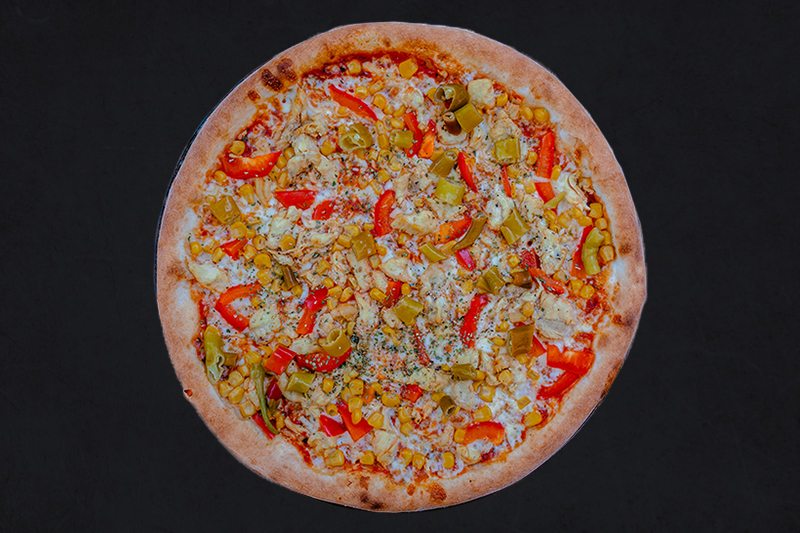 Tomatensauce, Mozzarella, Hühnerfleisch, Paprika, Mais, Scharfe Pfefferoni (A,C,G,L)