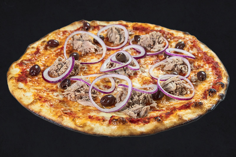 Tomatensauce, Mozzarella, Thunfisch, Rote Zwiebeln & Oliven(A,C,G,L)