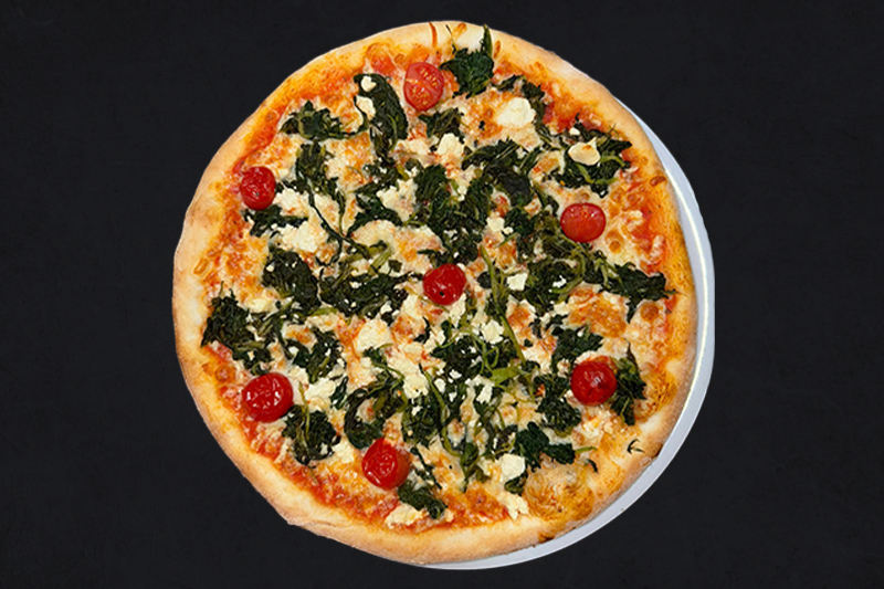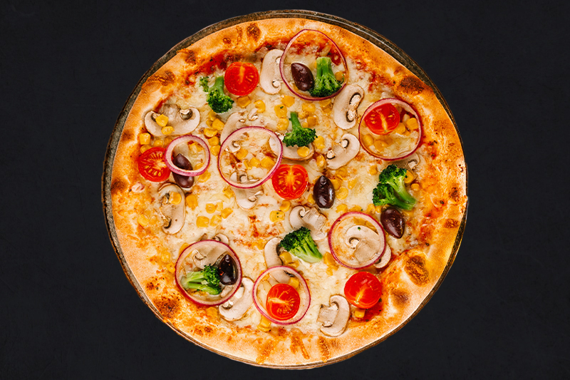 Tomatensauce, Mozzarella, Champignons, Cherry-Tomaten, Mais, Brokkolli, Oliven, Zwiebeln (A,C,G,L)